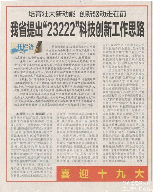 編者按:9月2日《陜西日?qǐng)?bào)》頭版開辟“喜迎十九大”專欄,反映全省各地各部門砥礪前行的生動(dòng)實(shí)踐,展現(xiàn)廣大干部群眾團(tuán)結(jié)奮進(jìn)的嶄新面貌,以優(yōu)異成績(jī)迎接黨的十九大勝利召開。開篇刊發(fā)《培育壯大新動(dòng)能 創(chuàng)新驅(qū)動(dòng)走在前 我省提出“23222”科技創(chuàng)新工作思路》文章,請(qǐng)閱讀!