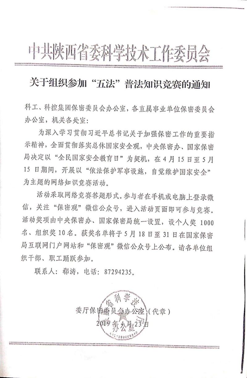 按照陜西省委科技工委《關于組織參加“五法”普法知識競賽的通知》要求和集團工作安排,陜西省委科技工委計劃于4月15日至5月15日期間開展以“依法保護軍事設施,自覺維護國家安全”為主題的網(wǎng)絡知識競賽活動。請各部門通訊員認真組織部門人員積極參加網(wǎng)絡競賽答題,并于5月16日將本部門參加答題情況匯總上報至院辦公室。