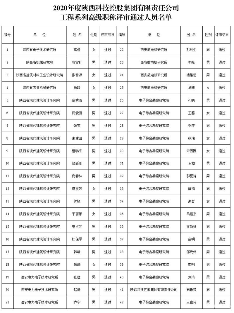 經(jīng)2020年度陜西科技控股集團有限責(zé)任公司工程系列高級職稱評委會評審,共42名同志通過評審,現(xiàn)予以公示。