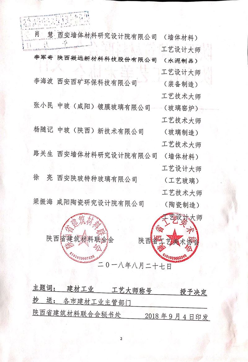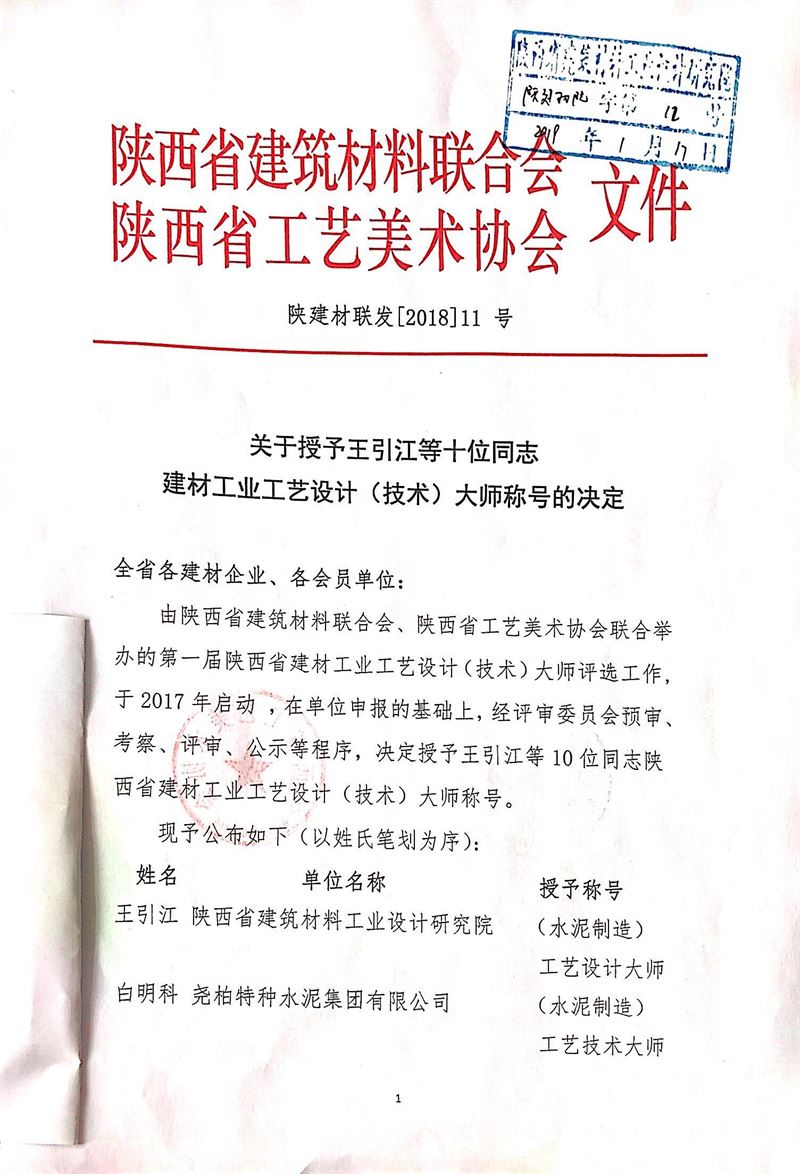 由陜西省建筑材料聯(lián)合會、陜西省工藝美術(shù)協(xié)會聯(lián)合舉辦的第一屆陜西省建材工業(yè)工藝設(shè)計(技術(shù))大師評選工作于2017年啟動,在單位申報的基礎(chǔ)上,經(jīng)評審委員會預(yù)審、考察、評審、公示等程序,我院王引江被授予陜西省建材工業(yè)工藝設(shè)計(技術(shù))大師稱號。